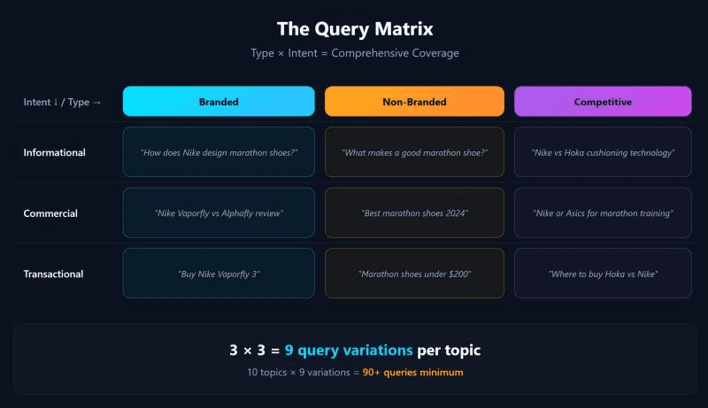 To generate queries systematically, you need two dimensions: query type and intent.