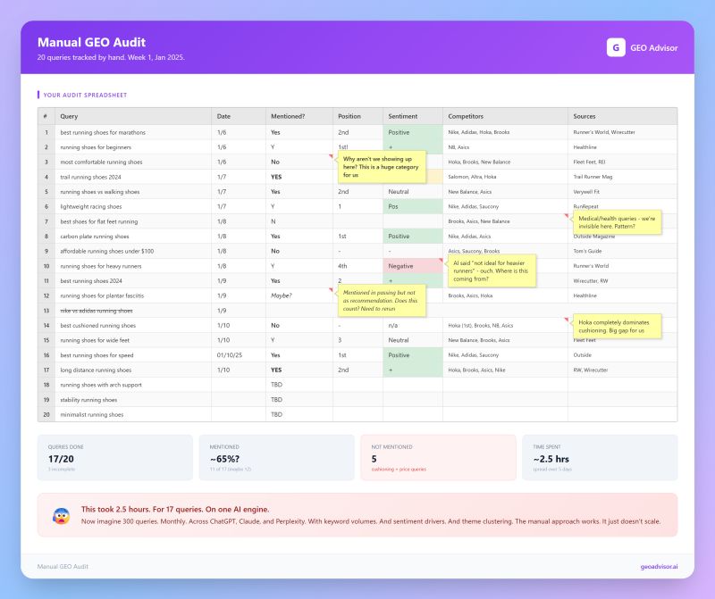 In the last post, I covered how query types and intent stages multiply into hundreds of queries. Today, I want to walk through what it actually looks like to run a GEO audit manually.